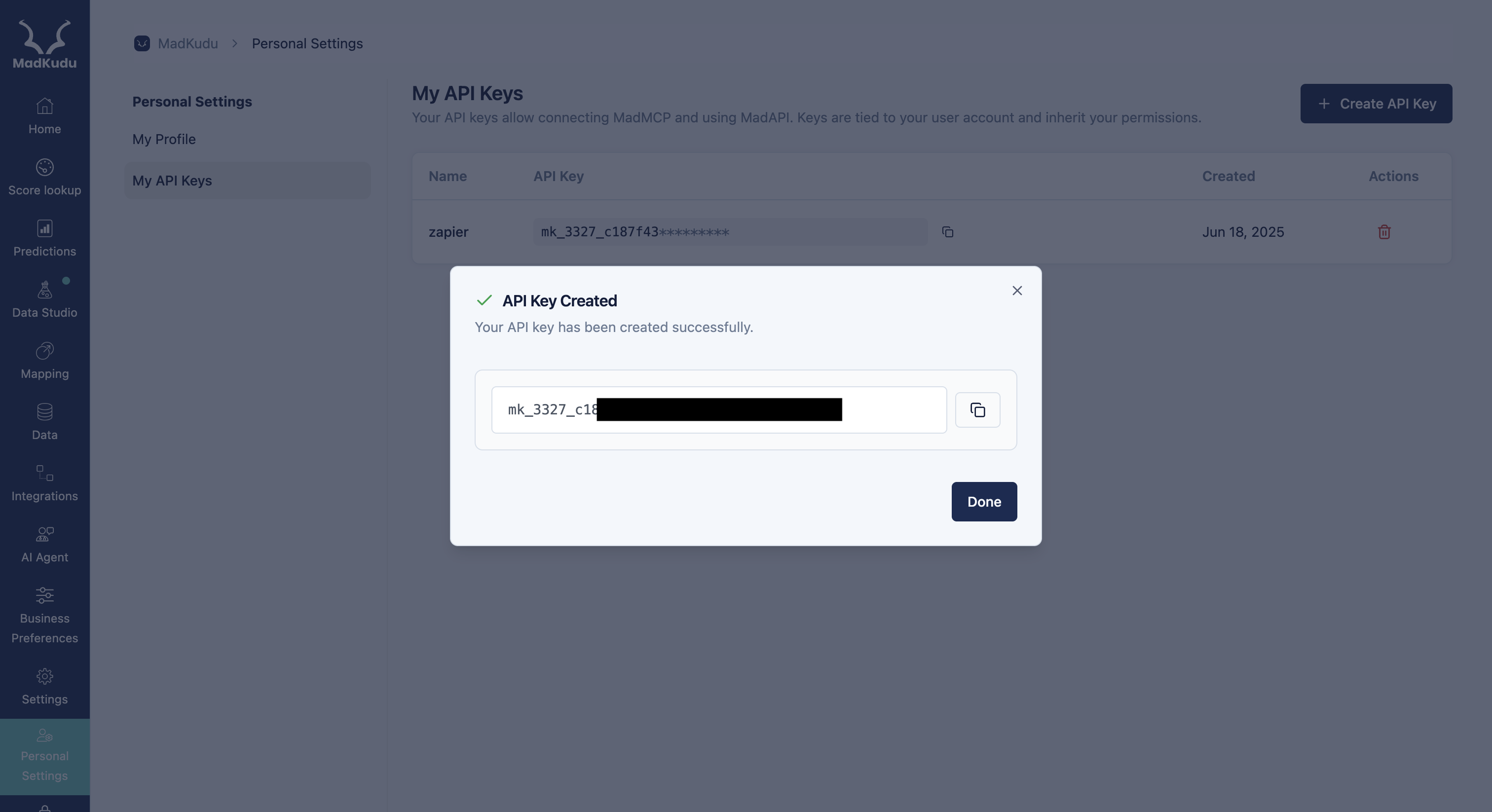 You'll use the API key when installing MadKudu MCP in your AI tools. Please[ follow instructions here](https://developers.madkudu.com/madkudu-mcp/what-is-madkudu-mcp)