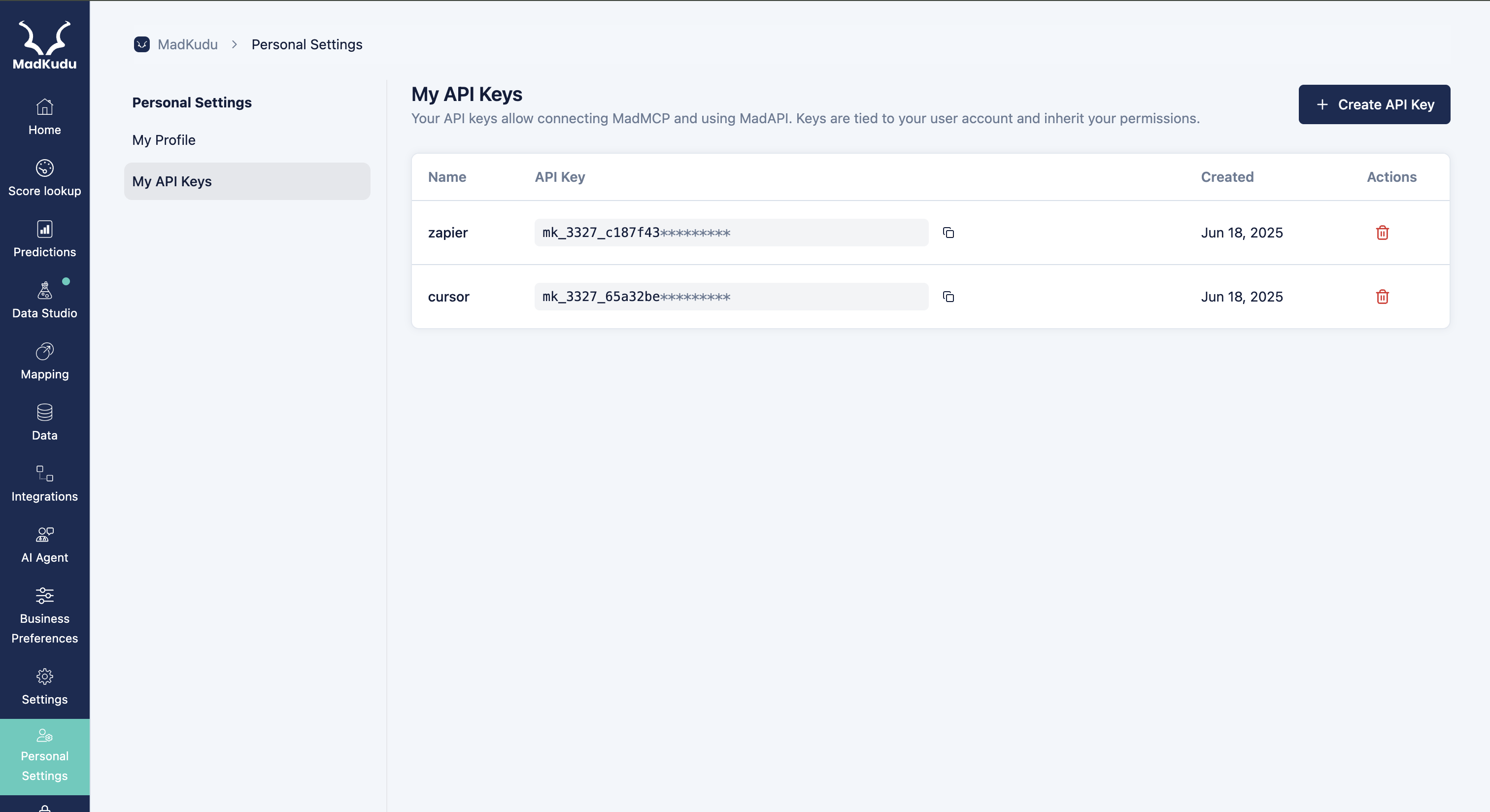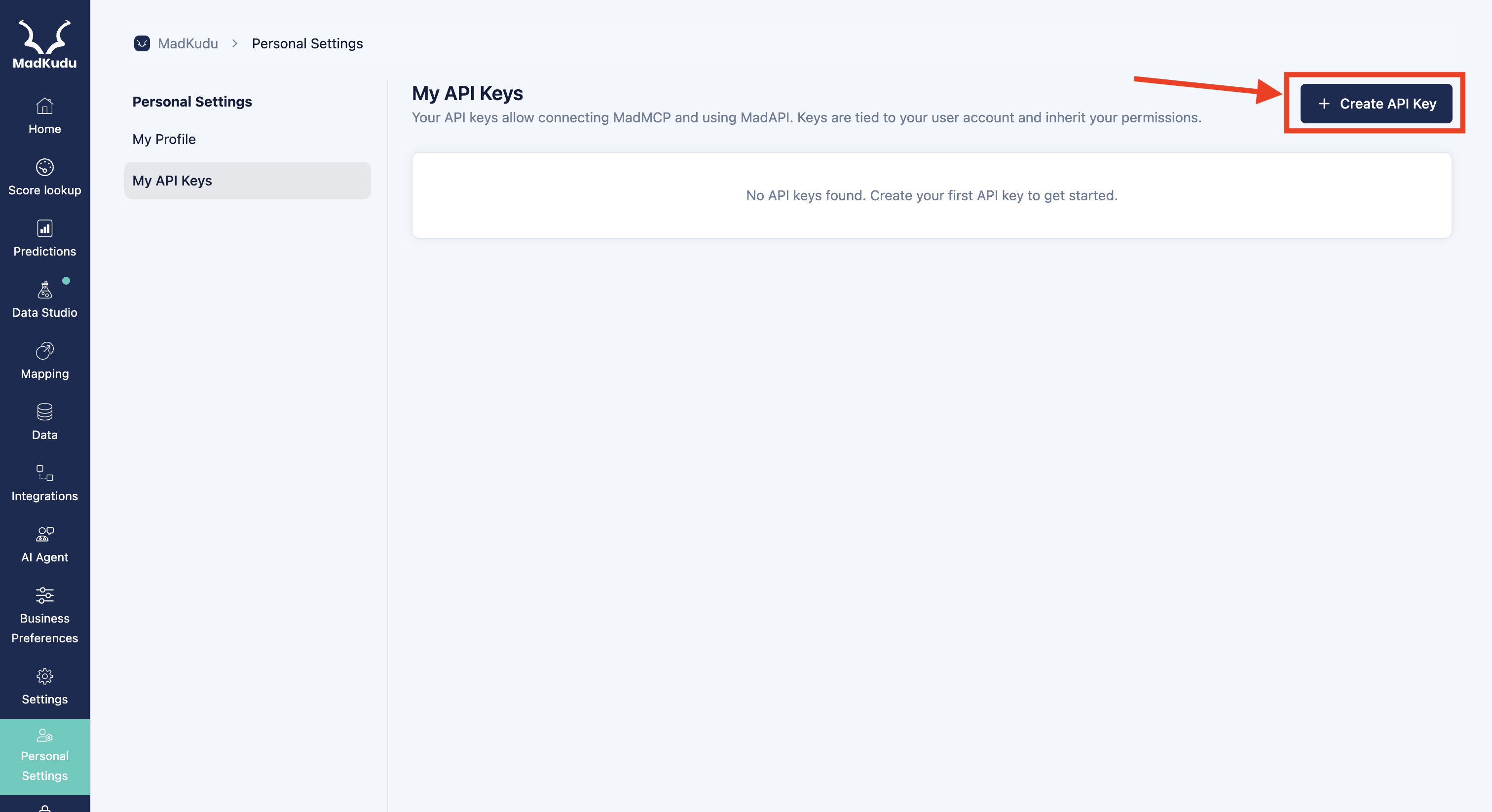 2. On the left navigation bar, go to **Personal Settings** then **My API Keys**